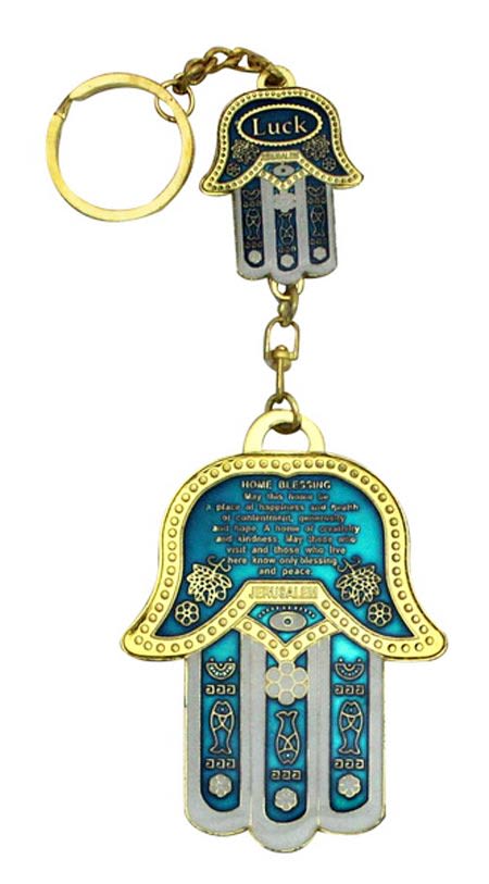 Schmuckvoll gestaltete blaue Hamsa mit Granatapfel-Motiven auf blauem, hellblauen und lila Hintergrund. Beschriftet mit dem englischen Segen für das Geschäft. Größe 15 x 19 cm
